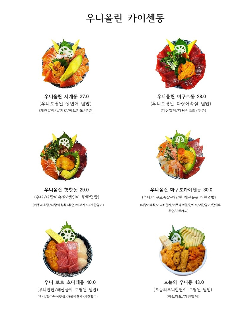 ๋ฉ๋ด๋ ์นด์ด์ผ๋, ๋ง๊ตฌ๋ก๋, ์ฐ๋๋ ๋ฑ ํด์ฐ๋ฌผ ๋ฎ๋ฐฅ ์์ฃผ์ผ.