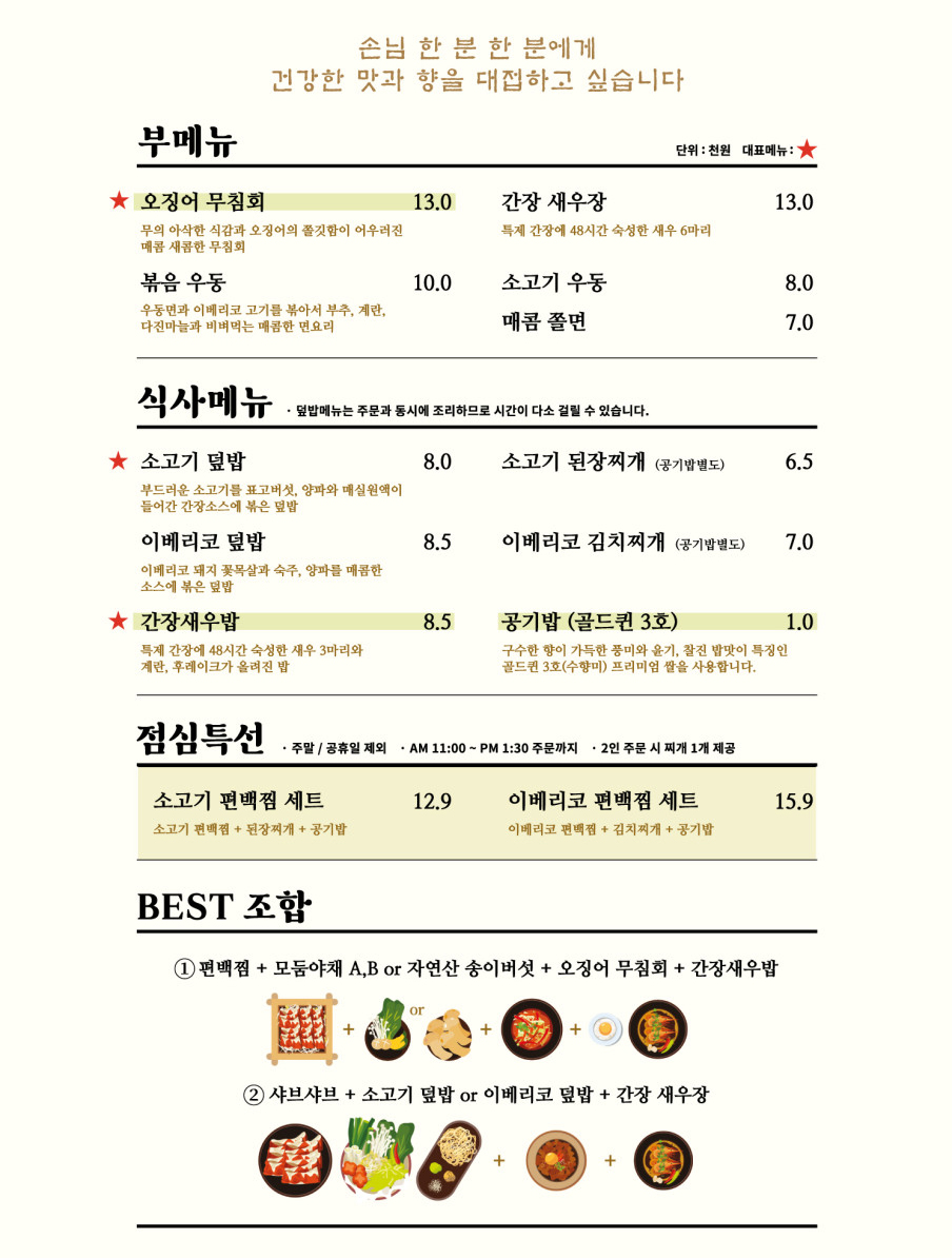 소고기, 숙주, 단호박, 버섯 등 야채 듬뿍 들어가서 담백하고 깔끔한 맛!